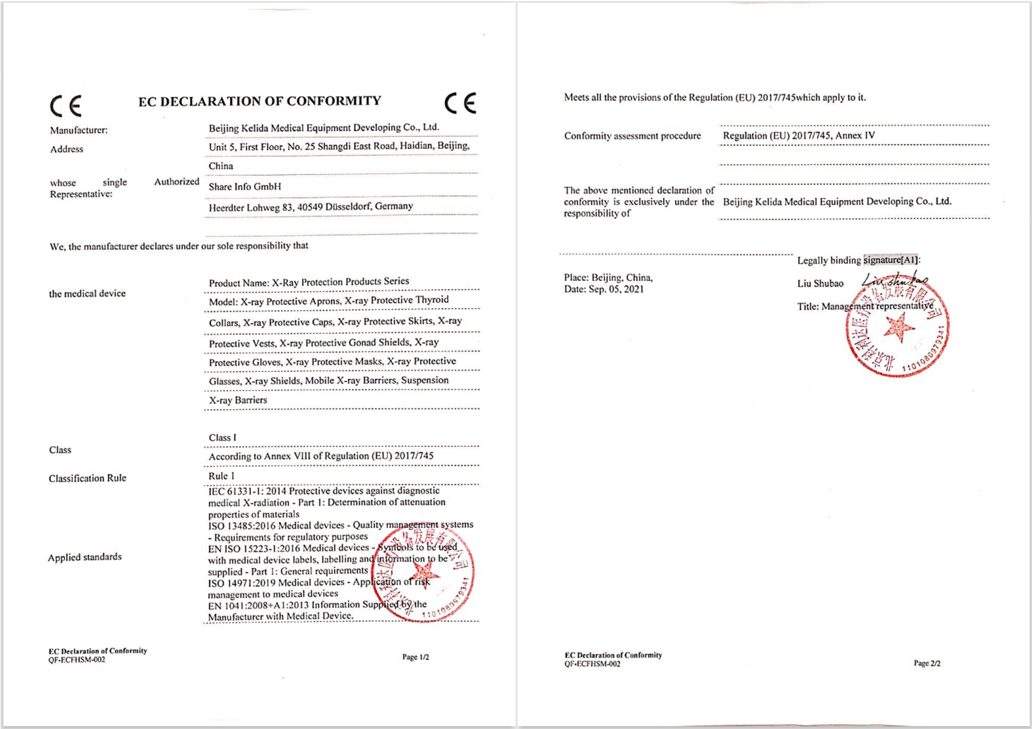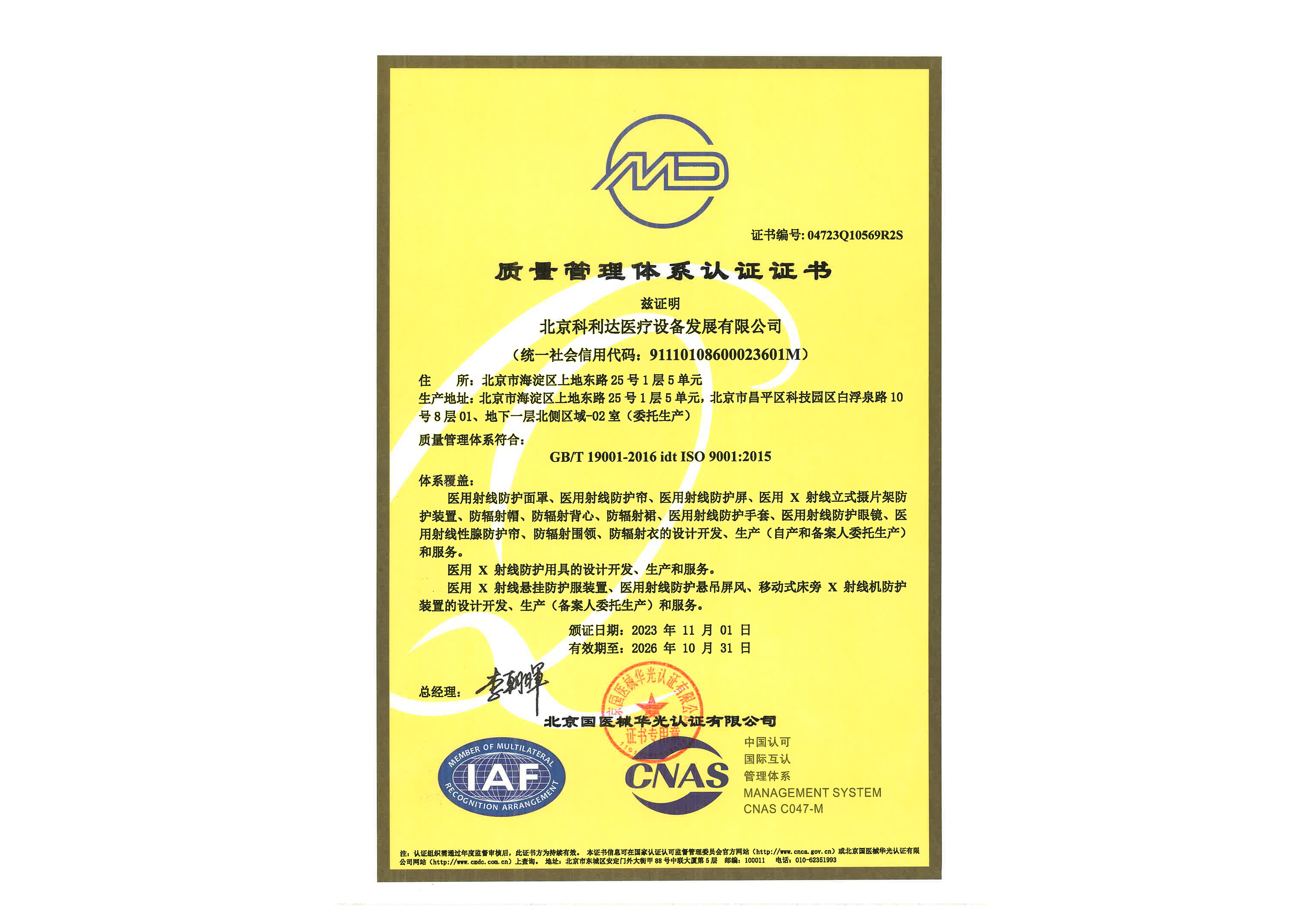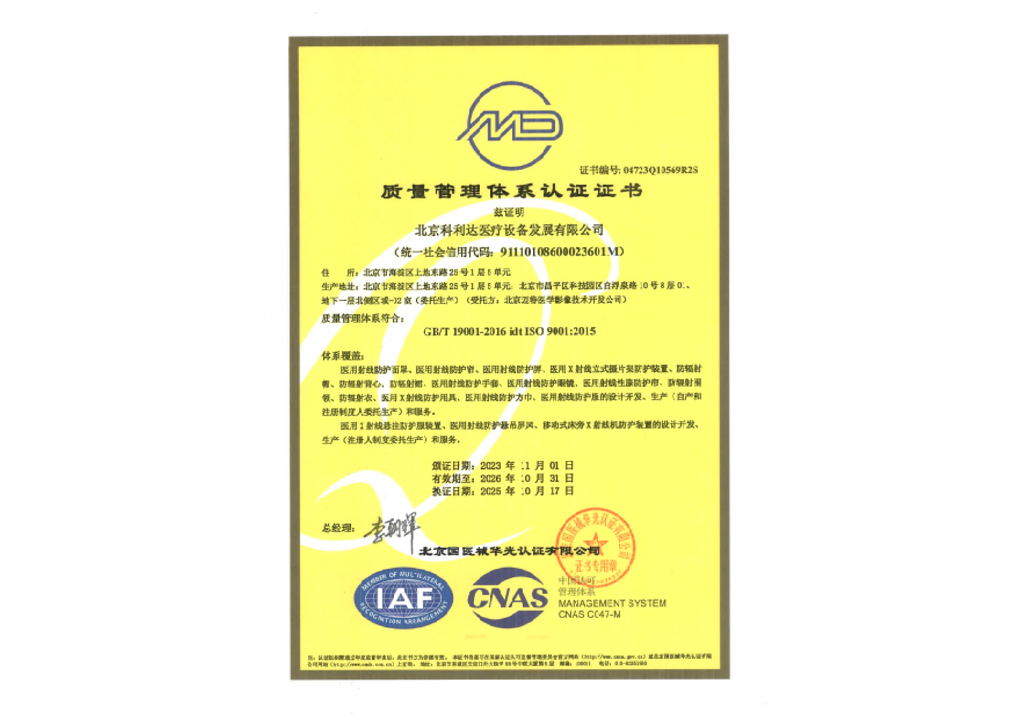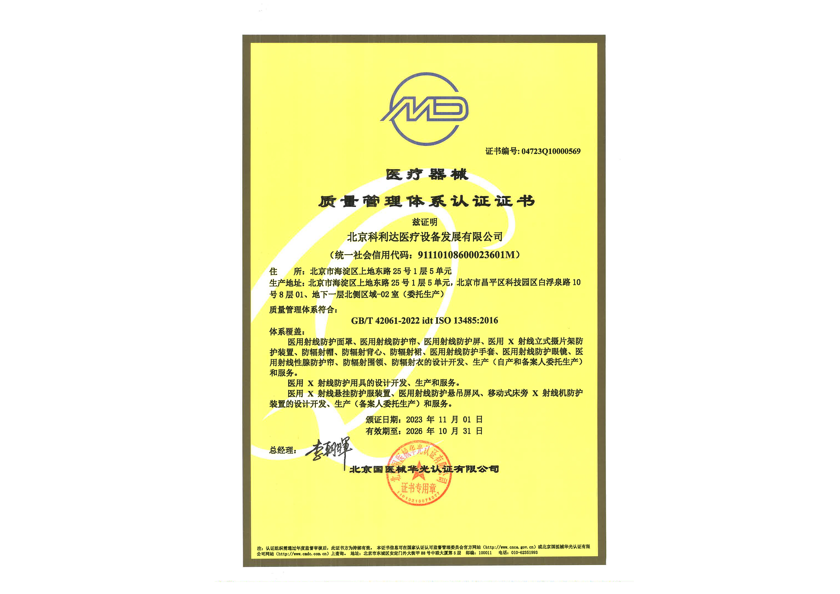 科利达射线防护产品获得欧盟产品CE认证和美国FDA市场准入。科利达公司规范的管理和严格的制度使其通过ISO13485:2016医疗器械质量体系认证和ISO9001:2015质量体系认证。